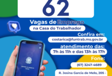 A Casa do Trabalhador de Costa Rica disponibiliza 62 vagas de Emprego na cidade de…