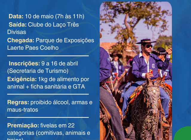 Uma das exigências para a participação é a saúde dos animais. Solicita-se a doação de 1kg/litro de alimento não perecível (arroz, óleo ou feijão) por animal inscrito, a ser entregue no ato da inscrição. Além disso, a Ficha Sanitária de equídeos deverá ser entregue até o dia 16 de abril de 2026. Os animais serão marcados no sábado, 9 de maio, no Clube do Laço Três Divisas, e deverão possuir a Guia de Trânsito Animal (GTA) para a cavalgada.