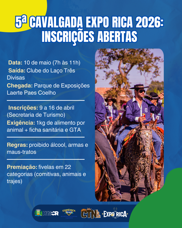 5ª Cavalgada Expo Rica 2026 define regulamento e premiações, inscrições abertas de 9 a 16 de abril