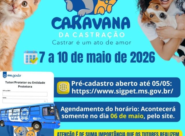 A cidade de Costa Rica será beneficiada com a Caravana da Castração, que acontecerá de 7 a 10 de maio de 2026. Este programa estadual oferece a castração gratuita de fêmeas de cães e gatos, visando fortalecer as políticas de bem-estar animal e controlar a população de pets no município.