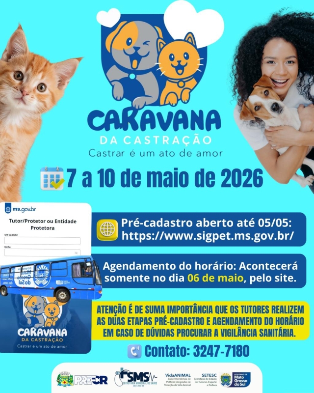 Os interessados devem realizar um pré-cadastro até o dia 5 de maio, acessando o site [SIGPET](https://www.sigpet.ms.gov.br/). O agendamento do horário ocorrerá apenas no dia 6 de maio, também pelo site. É de suma importância que os tutores completem ambas as etapas: pré-cadastro e agendamento do horário. Em caso de dúvidas, a Vigilância Sanitária pode ser contatada pelo telefone (67) 3247-7180.