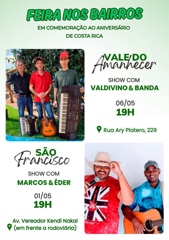 Na sexta-feira, 1º de maio, feriado nacional comemorado como o Dia do Trabalhador, o Bairro São Francisco receberá a 11ª Feira no Bairro, a partir das 19h, com um show musical ao vivo de Marcos & Éder. O evento será realizado no estacionamento do Terminal Rodoviário Coronel Domingos Augusto Coelho, localizado na Avenida Vereador Kendi Nakai e Rua Juscelino Manoel de Cruz.
