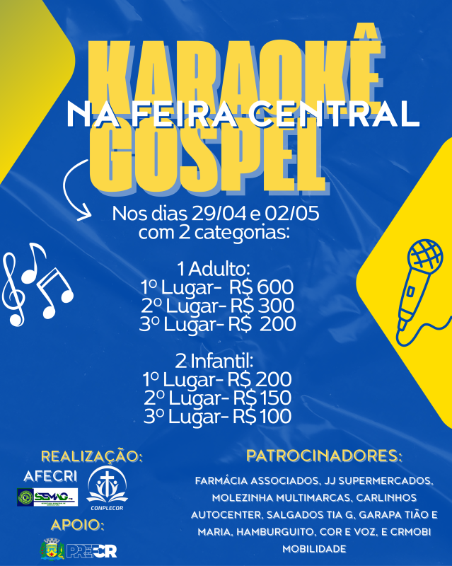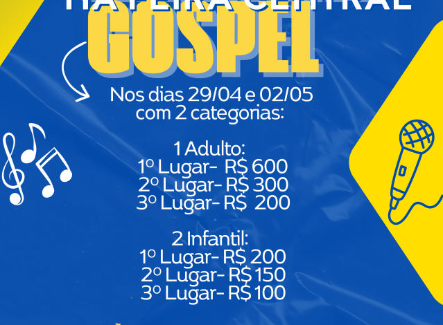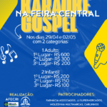 Nos dias 29 de abril (quarta-feira) e 2 de maio (sábado), a Feira Central realiza o Karaokê Gospel, que contará com inscrições gratuitas e duas categorias: Adulto e Infantil. Na categoria Adulto, os participantes concorrerão a prêmios de R$ 600, R$ 300 e R$ 200 para os três primeiros lugares. Já na categoria Infantil, os prêmios são de R$ 200, R$ 150 e R$ 100. A feira acontece na Avenida José Francisco da Silva, entre a Avenida José Ferreira da Costa e a Rua Ambrosina Paes Coelho, na região central da cidade.