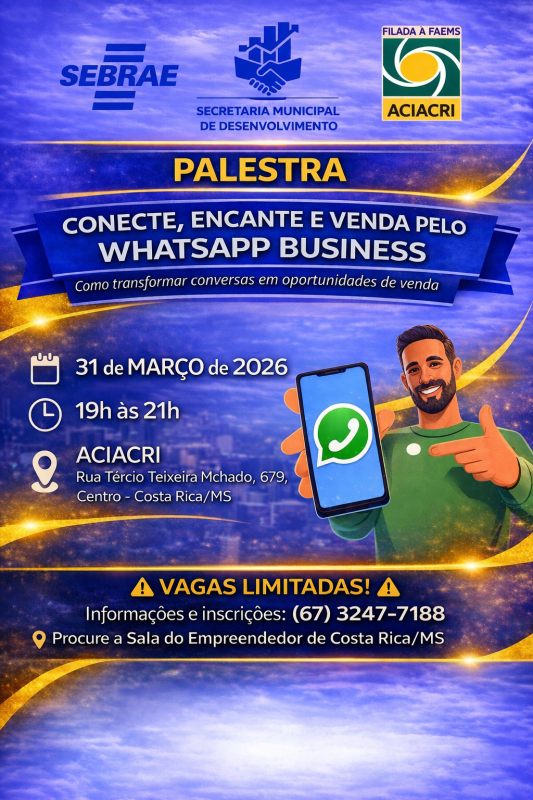 O Sebrae/MS, em parceria com a Associação Comercial, Industrial e Agropastoril de Costa Rica (ACIACRI), afiliada à Federação das Associações Empresariais de Mato Grosso do Sul (FAEMS), está promovendo uma oportunidade única para os empreendedores da região. Com o apoio da Prefeitura Municipal e da Secretaria de Desenvolvimento, por meio da Sala do Empreendedor, foram abertas as inscrições para a palestra gratuita “Conecte, Encante e Venda pelo WhatsApp Business: como transformar conversas em oportunidades de venda”.