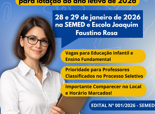 Ao todo, o edital prevê vagas para Educação Infantil urbana e rural, Ensino Fundamental – Anos Iniciais e Finais, além de componentes curriculares como Arte, Educação Física, Língua Inglesa, Língua Portuguesa, Matemática, Ciências, História e Geografia. O documento ainda reforça que o não comparecimento no local e horário estabelecidos implica perda da vaga, assim como estabelece regras para desistência, apresentação de documentação obrigatória e critérios para eventuais trocas de vagas, que só poderão ocorrer durante o ato oficial de lotação. O edital foi assinado pela secretária de Educação, Maria Almeida, no dia 27 de janeiro de 2026 e publicado no Diário Oficial do Município com republicação dia 28.